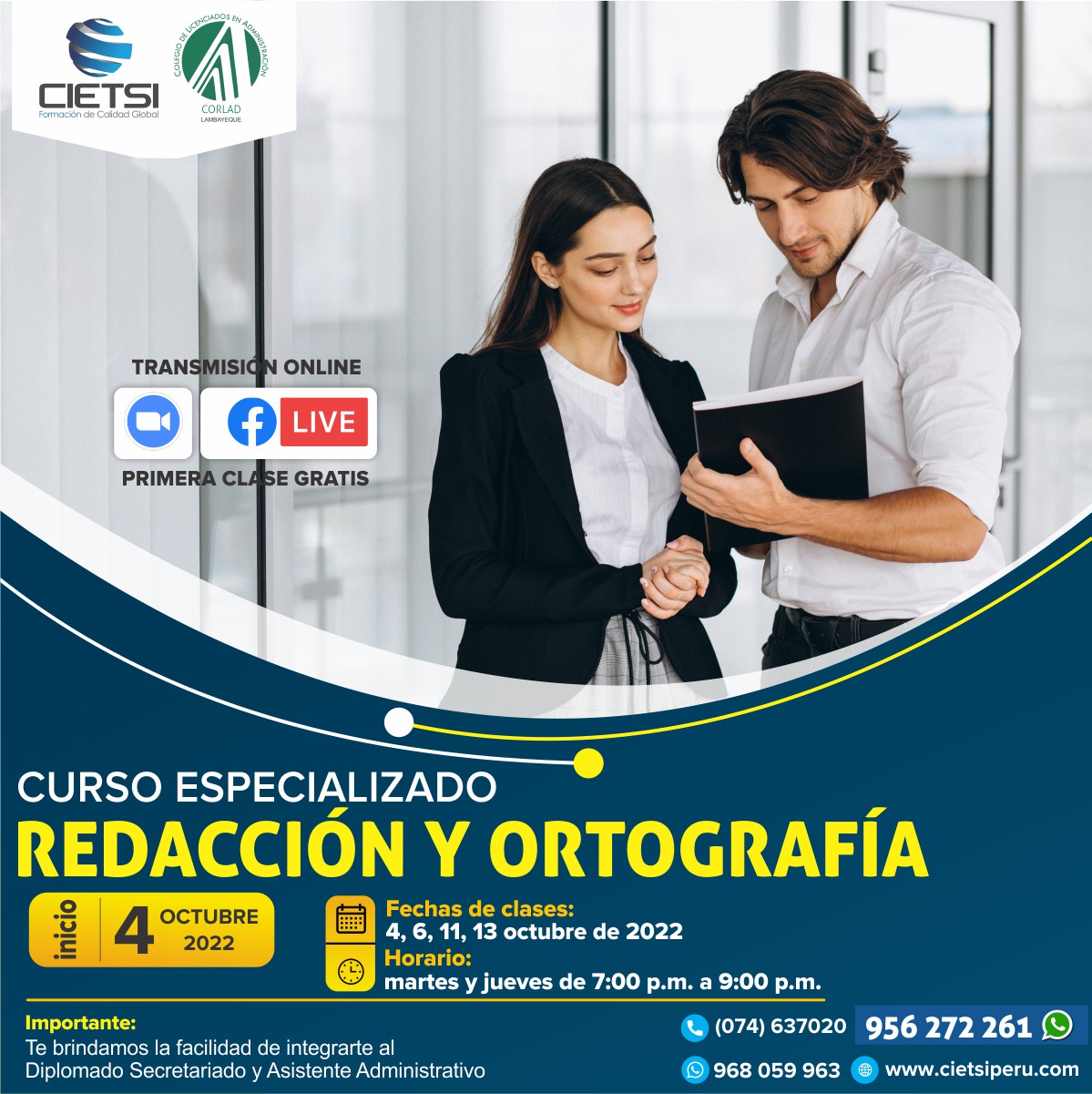 Una de las competencias laborales que deben demostrar los colaboradores dentro del mundo empresarial, es sin lugar a dudas, el de la comunicación efectiva, la misma que se transmite de forma oral y escrita. De ahí que la competencia comunicativa escrita requiere del conocimiento de diversos recursos lingüísticos y ortográficos, así como la capacidad para redactar, con coherencia y cohesión, documentos de gestión administrativa, que permita a los colaboradores comunicarse de manera efectiva en el entorno laboral. En tal sentido, el Centro de Altos Estudios CIETSI pone a disposición de la comunidad el CURSO ESPECIALIZADO “REDACCIÓN Y ORTOGRAFÍA”, a realizarse de manera online bajo plataforma zoom y campus virtual a nivel nacional e internacional.
