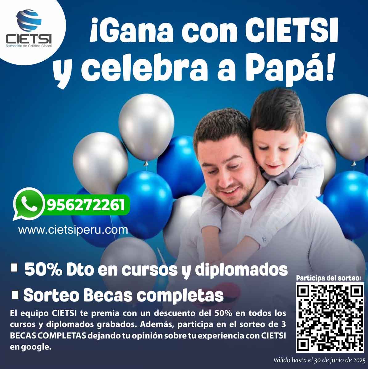 Realizado el pago comunicarse con nosotros enviando un email a informes@cietsiperu.com, con los siguientes datos (nombres completos, DNI, teléfono/celular, asunto: PROMOCIÓN POR DÍA DEL PADRE), adjuntando el comprobante de pago, luego de validar nos comunicaremos con usted a la brevedad.