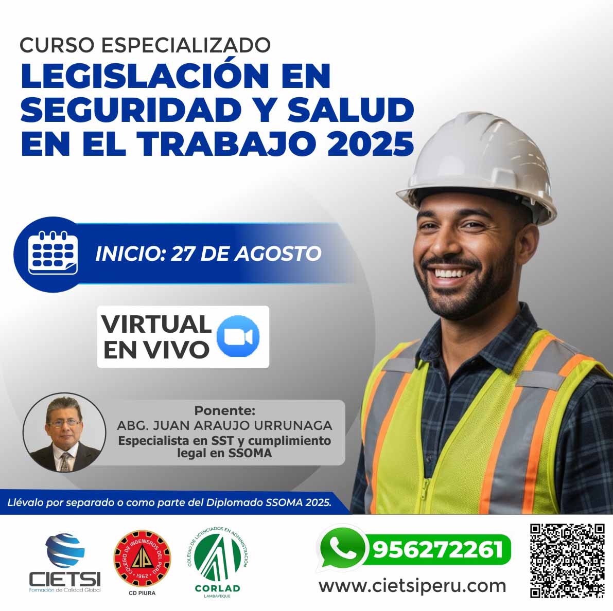 + Te brindamos la oportunidad de integrarte Diplomado de Especialización en Supervisión de Seguridad, Salud Ocupacional y Medio Ambiente SSOMA con opciones de certificación con la Universidad Nacional de TrujilloColegio de Ingenieros del Perú CD PiuraColegio de Licenciados en Administración Región Lambayeque o CIETSI.