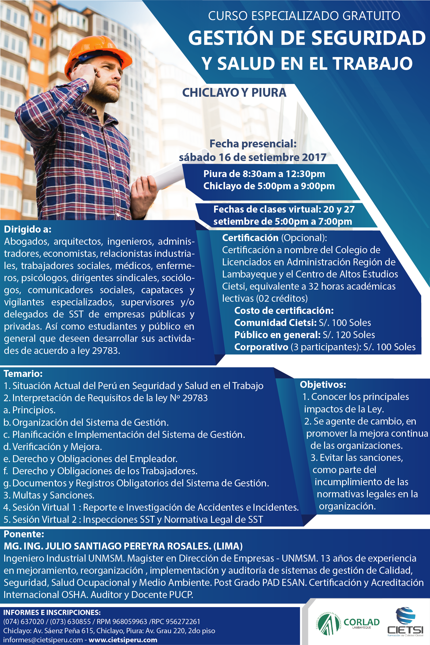 Abogados, arquitectos, ingenieros, administradores, economistas, relacionistas industriales, trabajadores sociales, médicos, enfermeros, psicólogos, dirigentes sindicales, sociólogos, comunicadores sociales, capataces y vigilantes especializados, supervisores y/o delegados de SST de empresas públicas y privadas. Así como estudiantes y público en general que deseen desarrollar sus actividades de acuerdo a ley 29783.