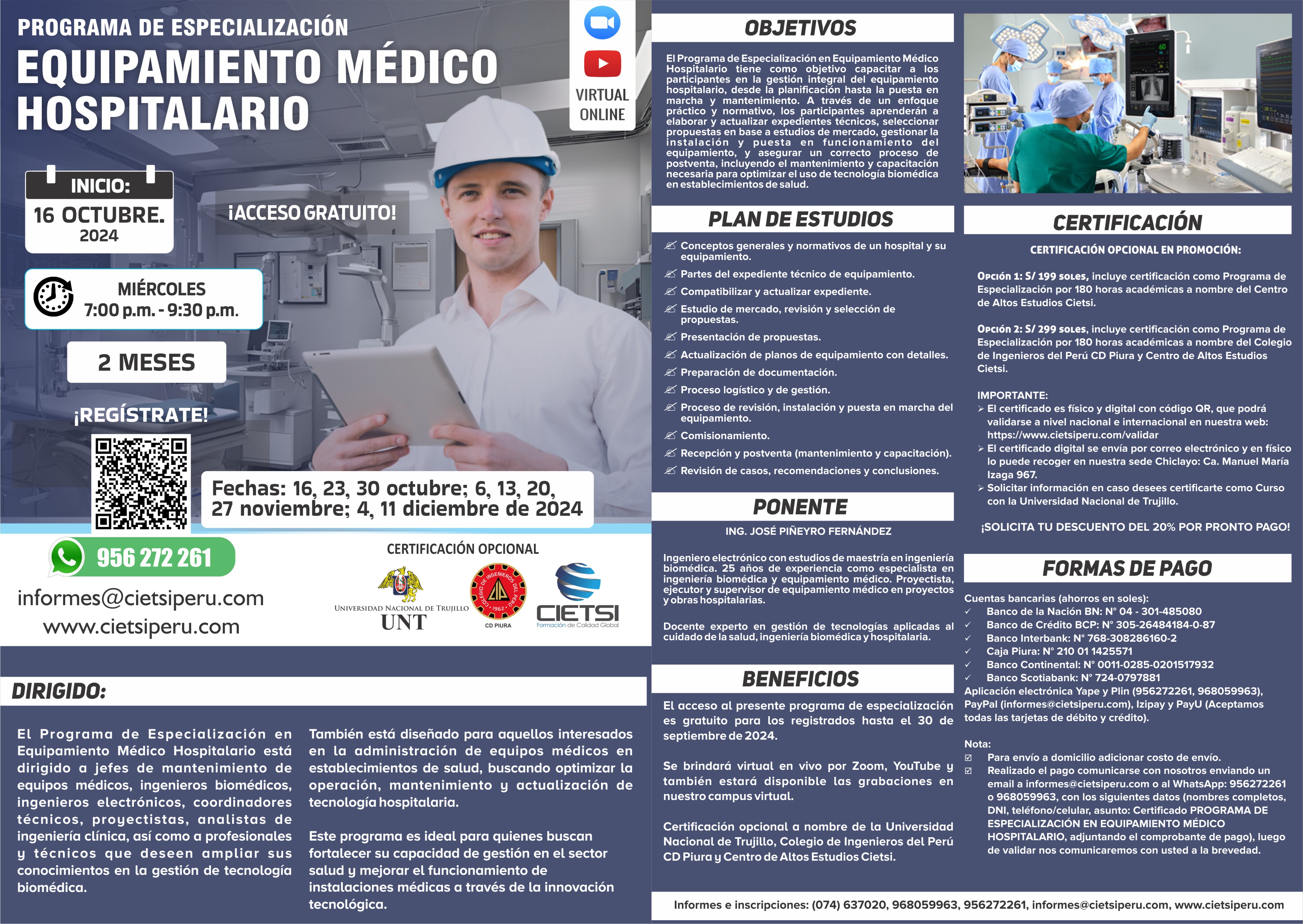 + Realizado el pago comunicarse con nosotros enviando un email a informes@cietsiperu.com o al WhatsApp: 956272261 o 968059963, con los siguientes datos (nombres completos, DNI, teléfono/celular, asunto: Certificado PROGRAMA DE ESPECIALIZACIÓN EN EQUIPAMIENTO MÉDICO HOSPITALARIO, adjuntando el comprobante de pago), luego de validar nos comunicaremos con usted a la brevedad.