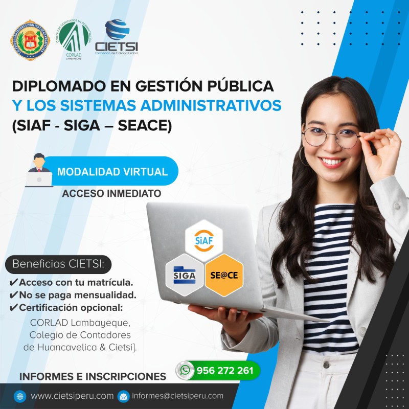 Lugar: Campus virtual Cietsi: https://institutocietsi.com/p/diplomado-en-gestion-publica-y-siaf-siga-seace/